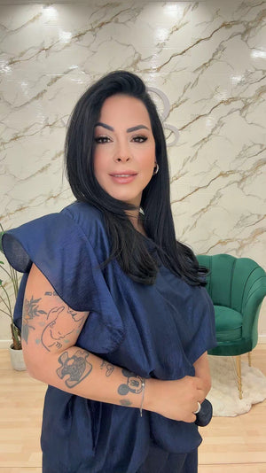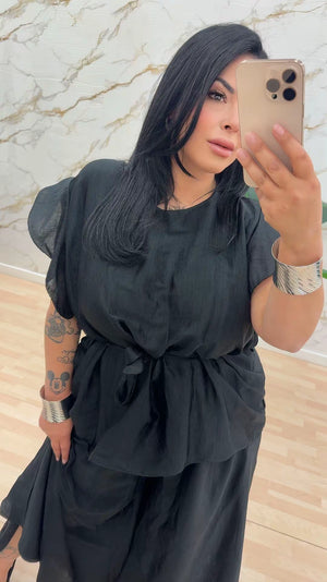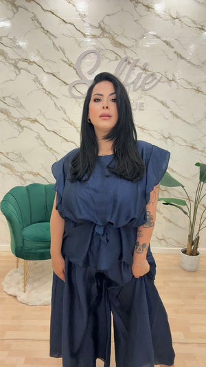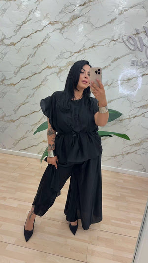 Coordinato composto da tunica con voilà alle maniche e cinturino incluso. Pantalone con elastico vestibilità ampia.