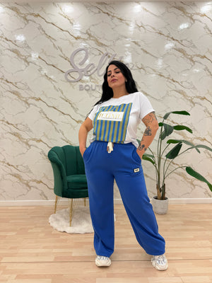 Pantatuta con coulisse in vita regolabile. Fondo dritto.